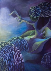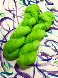 Colorway:"Neon Moon" is dyed to match "Sleeping Moon Ice". which is a painting from my "Enchant-knit Forest" Series and is titled as such because it reminds me of dark, ominous evenings. The blues add a bit of chill while the violets add the darkness to the whole scene. This specific green is the brightest color I dye - bright, fluorescent and fun! This yarn is dyed by hand using Jacquard Acid Dyes. Bright, vibrant colors that are lightfast and washfast.